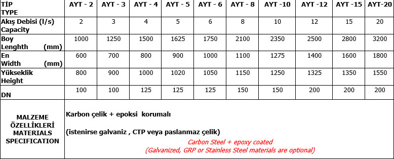Karbon Çelik + Epoksi Koruma. İsteğe bağlı olarak galvaniz, CTP veya paslanmaz çelik tercih edilebilir.